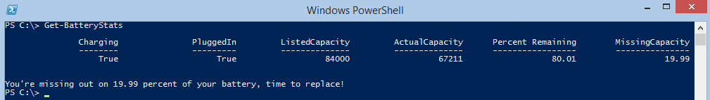 if ($batteryReport.MissingCapacity -eq 'ReRunOnBattery'){Write-Warning "Can't obtain missing power, rerun while unit is not plugged in to AC power"}ELSE{"You're missing out on $missing percent of your battery, time to replace!"}